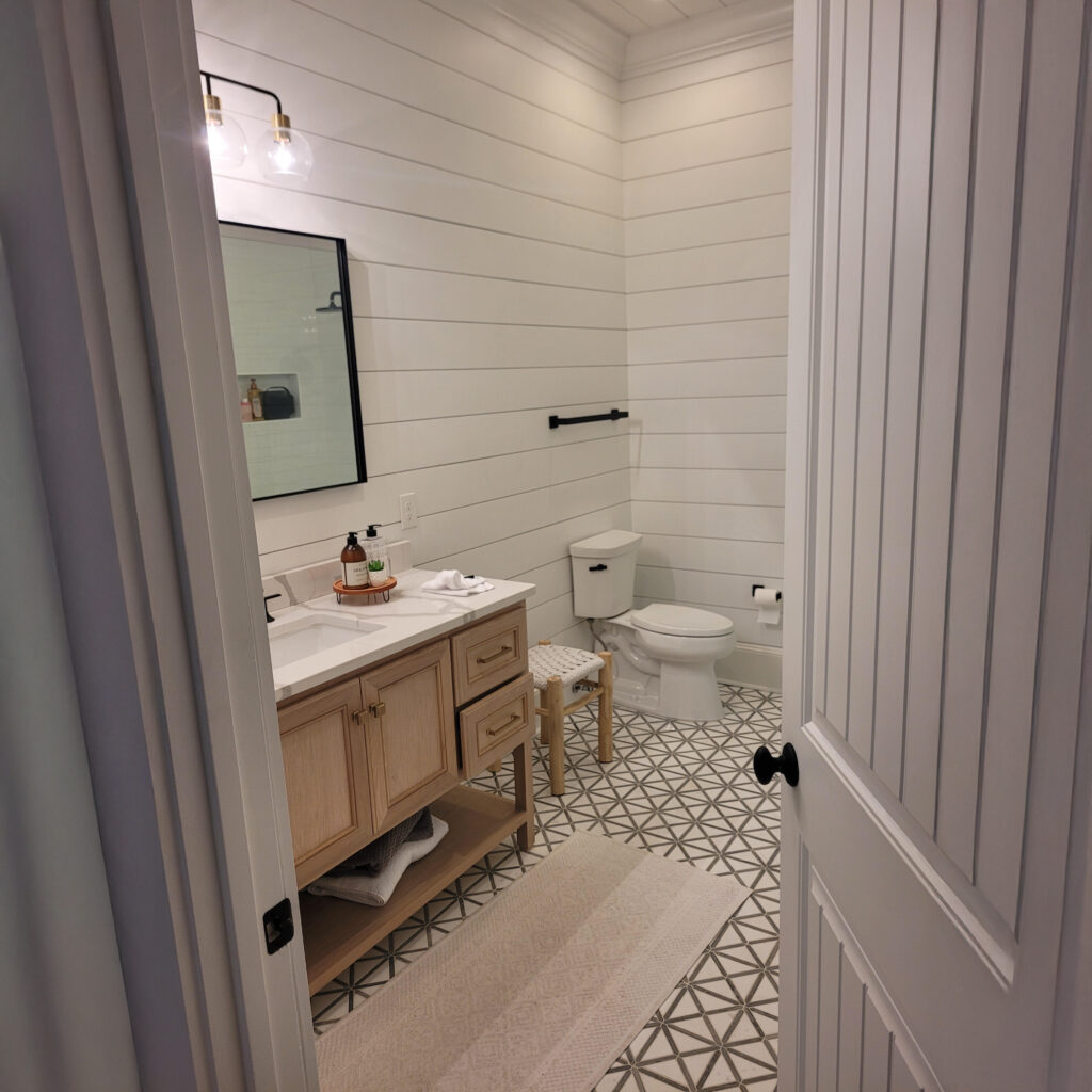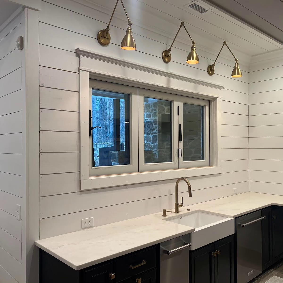 While the home is a very traditional style, the basement has more of a modern feel, with a custom steel barn door, modern light fixtures, and ship lap on all of the walls and ceilings. An accordion window that goes between the basement kitchen and the outdoor kitchen is a highlight of this project.